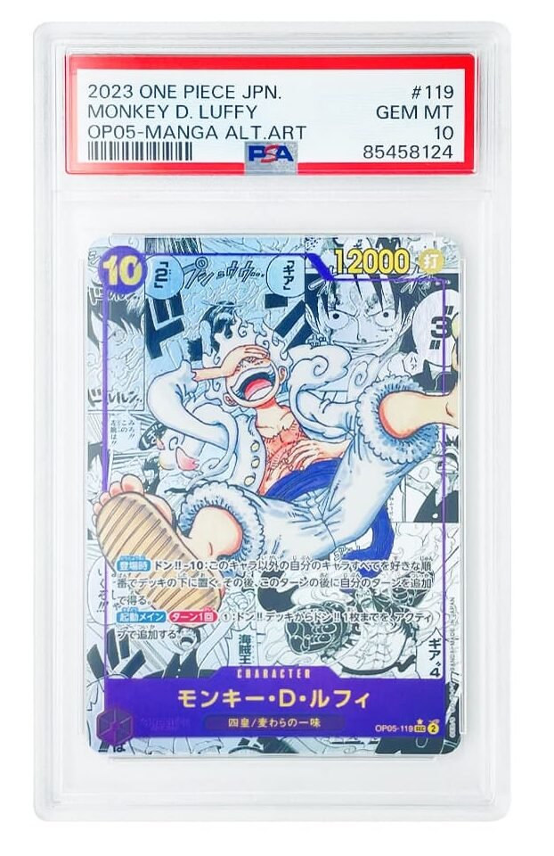 🥇 Monkey D. Luffy — Manga Alternate Art (OP05-119) — Awakening of the New Era La carta più costosa dell’intero TCG. Raffigura Luffy in Gear 5, con il suo vero potere del Nika risvegliato, su uno sfondo manga a pannelli. Uscita nell’agosto 2023, ha scalato rapidamente le classifiche diventando il pezzo più ambito dai collezionisti globali. Valore stimato: 2.000–5.000€ a seconda delle condizioni. La versione PSA 10 in inglese ha raggiunto picchi di vendita attorno ai 6.000€. Presente anche nel Premium Booster PRB-01 con artwork aggiornato.